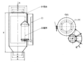顆粒(粉)狀料和混入原料中的磁性金屬夾雜物,經(jīng)入口后在永磁體四周形成環(huán)形料層,其中磁性金屬夾雜物因被磁場磁化而被吸附在永磁性的磁極板表面上,顆料(粉狀)原料則從磁場區(qū)通過,經(jīng)下端出口流出機外,從而達到分離的目的。